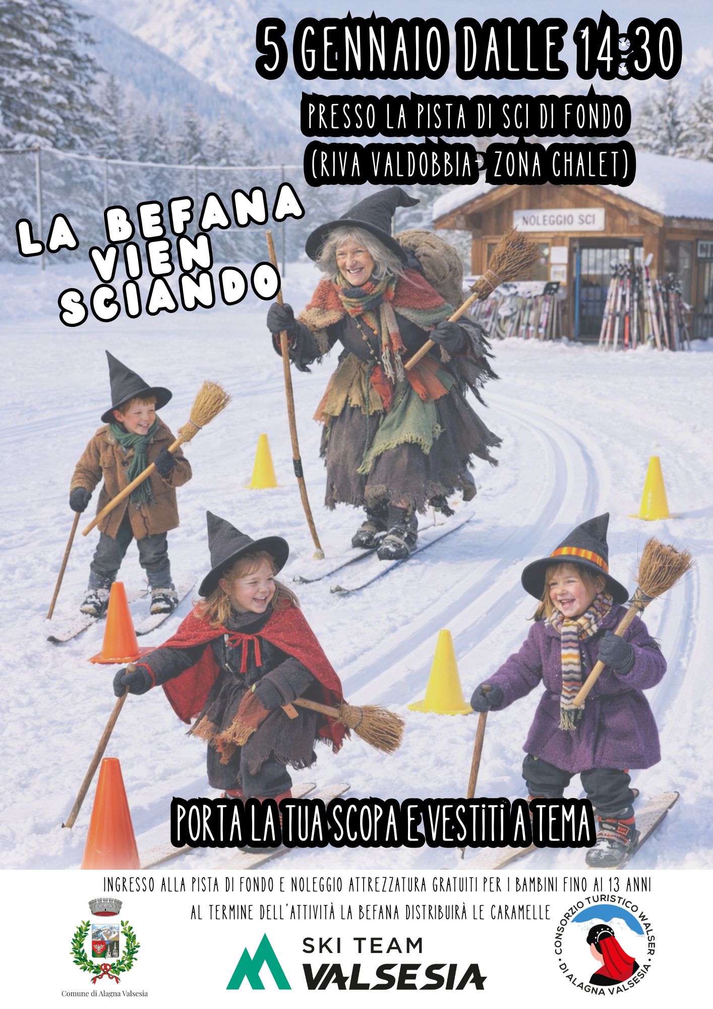 L'evento inizierà alle ore 14:30 presso lo Chalet a Riva Valdobbia, porta la scopa e vestiti a tema! L'ingresso alla pista di fondo e il noleggio dell'attrezzatura è gratuito per i bambini fino a 13 anni. EnglishThe event will start at 2:30 PM at the Chalet in Riva Valdobbia, bring your broom and dress up in theme! Entry to the cross-country ski trail and equipment rental is free for children up to 13 years old.
