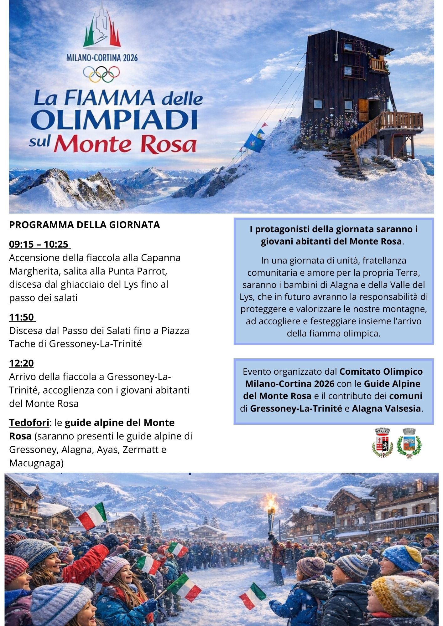 Il Piemonte e la Valle d’Aosta si preparano a vivere un momento di grande valore simbolico con il passaggio della Fiamma Olimpica di Milano Cortina 2026, emblema dei valori olimpici di pace, lealtà, inclusione e spirito sportivo. Nel suo percorso sul Monte Rosa, la Fiamma farà tappa anche alla Capanna Margherita (Alagna Valsesia) e a Gressoney-La-Trinité, dove martedì 13 gennaio, dalle ore 11:45, è previsto l’arrivo in Piazza Tache, alla presenza delle autorità locali e dei bambini delle scuole. L’iniziativa, organizzata dal Comitato Olimpico Nazionale Italiano in collaborazione con le Guide Alpine del Monterosa, intende rendere omaggio alle comunità che vivono e operano sul Monterosa, valorizzando il profondo legame tra sport, montagna e territorio. I Comuni accompagneranno questo momento significativo favorendo la partecipazione delle scuole e garantendo il necessario supporto logistico, in uno spirito di collaborazione e condivisione dei valori olimpici. La comunità è invitata a partecipare a questo evento di particolare rilievo simbolico. EnglishThe Piedmont and Aosta Valley are preparing to experience a moment of great symbolic value with the passage of the Olympic Flame of Milan-Cortina 2026, emblematic of the Olympic values of peace, loyalty, inclusion, and sportsmanship. On its journey on Monte Rosa, the Flame will also stop at the Capanna Margherita (Alagna Valsesia) and in Gressoney-La-Trinité, where on Tuesday, January 13, starting at 11:45 AM, it is expected to arrive in Piazza Tache, in the presence of local authorities and schoolchildren. This initiative, organized by the Italian National Olympic Committee in collaboration with the Alpine Guides of Monterosa, aims to pay tribute to the communities that live and work on Monterosa, enhancing the deep connection between sport, mountain, and territory. The municipalities will support this significant moment by encouraging school participation and ensuring the necessary logistical support, in a spirit of collaboration and shared Olympic values. The community is invited to participate in this event of particular symbolic importance. |